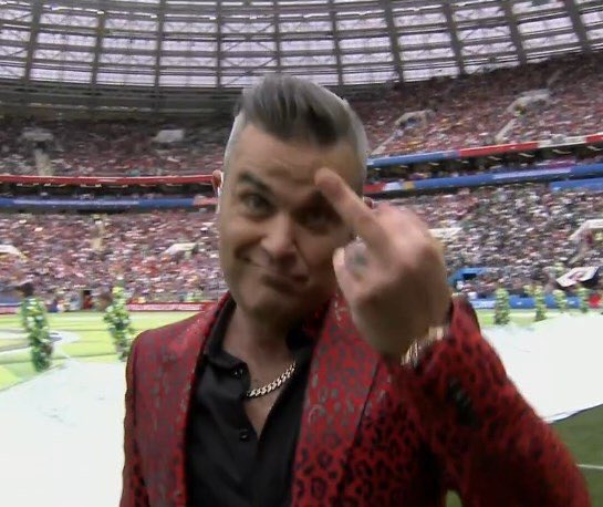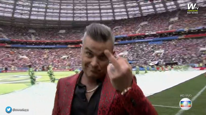 A imagem de destaque do dia não é um dos gols que a Seleção da Rússia fez Arábia na goleada por 5 a 0 na partida de abertura. Na verdade o primeiro meme da Copa foi uma imagem do cantor Robbie Williams, que se apresentou na Cerimônia de Abertura da Copa, mostrando o dedo do meio num sinal ofensivo pra câmera enquanto dá um sorriso presunçoso. A imagem aparece no tweet em posição de primeiro, terceiro e sexto lugar na análise tornando ela a imagem mais relevante do dia.