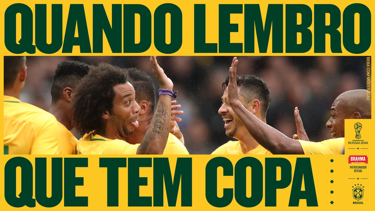 Em nono lugar, temos um tweet do perfil oficial da cerveja Brahma com uma foto de jogadores da seleção brasileira rindo felizes e a legenda “Quando lembro que tem Copa”.
